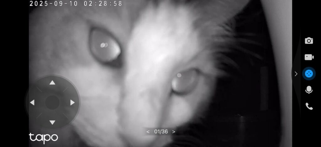 - とにかく画質がきれい スマホで確認すると、猫の表情や、ふわふわの毛並みまでしっかり見えます。暗い部屋でも赤外線モードに切り替わり、夜でもはっきりと映るのが驚きでした。